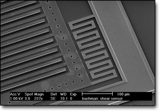 SEM scan of a surface micromachined device designed at UCI to measure shear stress on wing surfaces during wind tunnel tests.